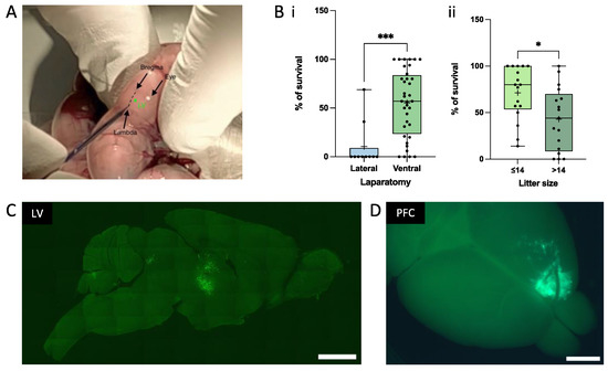 The in utero technique. (A) Illustration of the site of injection for Lateral Ventricle (LV) surgery. (B) Pup survival as a function of the laparotomy technique (Bi) and litter size (Bii). Pup survival is higher when the ventral laparotomy is performed on mice that have less than 14 embryos. Each point of the boxplot corresponds to the survival percentage in one litter. (* = p < 0.05; *** = p < 0.001, unpaired t-test). (C) Sagittal picture of a brain section at 1 MPT into LV taken with an epifluorescence microscope. Cells are labeled with GFP. (D) Illustration of a graft within the PFC at 1 MPT taken with an epifluorescence macroscope. Scale bars = 2 mm.