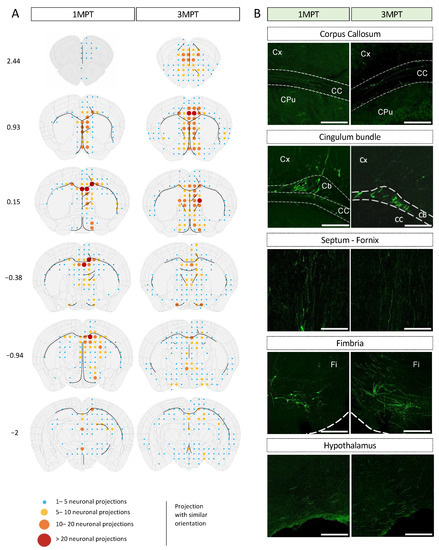 Mapping of neuronal projections from transplanted human cells within the LV of the embryonic mouse brain at 1 MPT and 3 MPT. (A) Camera lucida drawings are according to Allen Brain Atlas (https://mouse.brain-map.org/, accessed on 25 January 2023). Image credit: Allen Institute. The densities of neuronal projections are depicted using a code-color schematic representation. Results are calculated as the mean value from three independent mice. Two to three brain sections were analyzed for each coordinate (Bregma, indicated in mm) and per mouse. (B) Representative images of GFP+ projections at 1 MPT and 3 MPT in fiber tracks and brain regions such as the cortex (Cx), corpus callosum (CC), cingulum bundle (Cb), septum/fornix, fimbria (Fi), and hypothalamic region. The illustrated data are from the three representative brains. Scale bars = 200 µm.