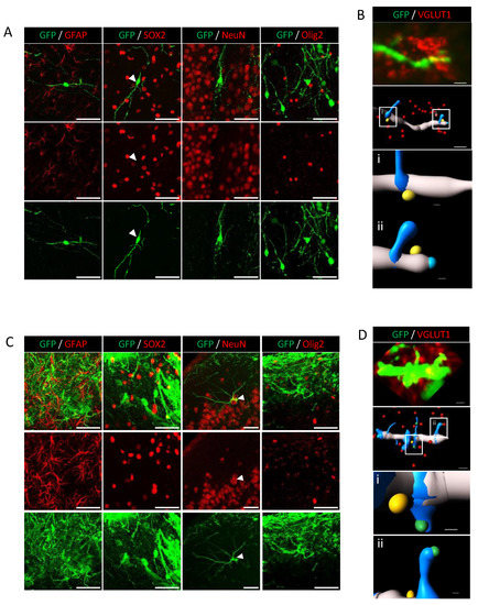 During brain development, specific neuronal subtypes are produced in a specific temporal manner. The protocol we used for the derivation of human NPCs into cortical pyramidal neurons was adapted from Boissart et al. [27]. It allows the NPCs to differentiate into large proportions of excitatory neurons (≅80%), mainly from the cortical layers II-IV, and, to a lesser extent, into GABAergic cells (≅20%) in vitro. Using the immunostaining approach, there was an absence of SOX2 and GFAP labeling of human cells after in utero transplantation at 3 MPT, and in LV and PFC conditions. We did not observe any SOX2 or GFAP expression in the differentiated cells in these conditions (Figure 5A–C, Video S3). Our data are consistent with those obtained in vitro (Figure 1) and indicate that human cells have lost their capacity to proliferate without differentiating into astrocytes at 3 MPT after LV and PFC transplantation. It has been previously shown that sequential mechanisms may exist and confer young neurons to differentiate into astrocytes [46]. Therefore, one cannot exclude some derivation of human cells into astrocytes at later stages of neuronal differentiation as we could observe in vitro at 40–45 days of differentiation using the same iPSC line together with two other iPSC lines [26]. We analyzed the expression of the neuronal nuclear marker NeuN, a selective marker of postmitotic neurons. We could not clearly identify isolated mature neurons that co-expressed NeuN and GFP at 3 MPT after LV transplantation and in all of the neuronal migration brain subregions (Figure 5A). By contrast, NeuN was clearly expressed in the human NPC-derived pyramidal cells after PFC transplantation, as illustrated in Figure 5C. As a marker for glutamatergic neurons, we selected the vesicular glutamate transporter VGLUT1, which is expressed in all of the neuronal migration brain regions [47]. We could detect the expression VGLUT1 in NPC-derived neurons after LV and PFC transplantation at 3 MPT. The 3D reconstruction and zoomed-in visualization of dendrite segments and spines allowed us to demonstrate at a microscale the colocalization of VGLUT1 with GFP labeling (Figure 5B–D). We could observe that VGLUT1 was only expressed at the levels of dendritic shafts after LV transplantation but also at the spine levels after PFC transplantation (Figure 5D; Videos S4 and S5). We also analyzed the expression of the oligodendrocyte marker Olig2 and did not detect any colocalization of Olig2 with GFP labeling (Figure 5A,C). For analysis of progressive cell death over time, we tested the expression of apoptosis-related caspase-3 protein at 1 MPT and 3 MPT (Figure S2). Our results did not show any significant caspase-3 labeling at the two time points. To evaluate the maturation of the transplanted cells between LV and PFC transplants, we analyzed the differential expression of the NeuN marker for mature neurons with that of β3-tubulin, a marker of the early phases of neuronal differentiation (Figure S3). Our results strongly suggest higher levels of neuronal maturation with increased glutamate levels neurotransmission in human NPC-derived neurons transplanted in PFC, as compared to those transplanted in LV.