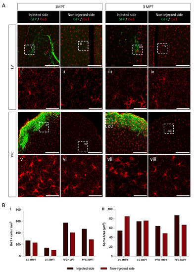 Microglia recruitment around the grafted area, related to Figure 5. (A) Confocal images at 1 MPT and 3 MPT of the injected and non-injected sides for LV- and PFC-transplanted mice. The transplanted cells are labelled with GFP, and microglia is shown in red. Pictures i–viii show the higher magnification of the area for the analysis of microglia morphology on one representative brain for each condition. Scale bar = 200 µm and 5 µm for i–viii. (B) Plot showing microglial density (Bi) and soma area (Bii) for each condition. Quantification was performed on the 20× images, using the MorphoLibJ plugin in Fiji.