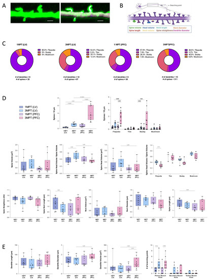 Dendritic spines are important for the establishment of most excitatory synapses and the cortical circuits. Their density and structural plasticity are thought to directly reflect the glutamatergic synaptic transmission and synaptic plasticity in the brain cortex during development, as well as the developed adult brain. Each spine may allow the neuron to control its local activity. The aim of this study was to understand the contribution of the local host environment in spinogenesis processes. Our objectives were to compare the spine maturation in human cortical pyramidal neurons derived from transplanted NPCs at 1 and 3 MPT after their in utero engraftment into the LV of the mouse embryo (E17.5); and the spine maturation after transplanting the human NPC into two distinct embryonic regions, namely the LV and the PFC, at 1 and 3 MPT. For these experiments, we used our previously reported method, which consists of the 3D reconstruction and quantitative analysis of diverse structural spine parameters on iPSC-derived pyramidal neurons [9,29] (Figure 7A; Video S6). The set of morphological parameters that have been measured in our study are depicted in Figure 7B. The diverse morphologies of dendritic spines have been reported previously with the classical distinction between filopodia, thin, stubby, and mushroom forms [54]. The spine diversity appears to be directly related to its stability and functional activity [54]. Figure 7C illustrates the proportion of the four spine categories, tested under each experimental condition. We could observe a large proportion (90%) of filopodia at 1 MPT after LV transplantation. The proportion of filopodia at 1 MPT was lower in PFC as compared to the LV transplants but remained in the major spine category (57.9%). This indicates that spines at this stage are still immature. The NPCs have moved forward to the cortical zones, and this may be the reason for the delay in the maturation process. In contrast to filopodia, the stubby and mushroom categories have been recently shown to possess a post-synaptic density with similar average protein copy numbers and topologies [55]. At 3 MPT we observed that the proportion of stubby and mushroom spines increased in the LV transplants, while only the proportion of stubby spines increased in the PFC transplants (Figure 7C). These data indicate an increase in the level of maturation until 3 MPT. We could also observe a significant increase in the total spine densities at 3 MPT compared to 1 MPT after transplantation of the NPCs into LV and PFC, with an even higher increase in the PFC-transplanted neurons compared to LV. Such increases were more pronounced for the filopodia and stubby than for the thin and mushroom categories (Figure 7D). The spine densities were very similar to those we reported previously in neonatal grafting [9], as well as those reported in a recent study using human-transplanted organoids [13]. By contrast, the total volume of spines remained unchanged over the four conditions tested. At 3 MPT, a slight but significant decrease in the relative spine head volume was observed in the PFC transplants compared to the LV transplants. This effect was predominantly observed for the filopodia spines (Figure 7D). Our results also indicate that the spine straightness and neck morphologies remained unchanged in all of the tested conditions, despite a slight decrease in the spine neck length between 1 MPT and 3 MPT in the LV transplants (Figure 7D). The total spine length was significantly lower in PFC as compared to LV at 1 MPT. We also observed a 38% increase in the total spine head volume together with a 37% decrease in the total spine neck length after transplantation within the LV. These data strongly suggest that a coordinated regulation of the neck morphology and synaptic maturation could occur and be linked to functional neuronal maturation [54]. Finally, we measured the morphological parameters of the dendrites from human cortical pyramidal neurons. While the dendrite length remained unchanged between all of the conditions tested, we could observe a significant increase in the dendrite diameter and dendrite volume, as well as the number of primary branching points at 3 MPT, when the NPCs were transplanted in the PFC compared to the LV (Figure 7E). In addition, the dendrite volume was significantly increased between 1 MPT and 3 MPT in the PFC transplants (Figure 7E). Altogether, our data show a higher complexity of dendritic arborization of the cortical pyramidal neurons when directly transplanted within the PFC compared to the LV. In parallel to higher dendritic complexity, higher spine densities were predominantly observed, while the spine intrinsic characteristics remained similar between the PFC and LV. Neuronal maturation represents a continuous process that is under the influence of local and extrinsic factors, which may affect cell migration and maturation. At the level of the LV transplants, the human-transplanted NPCs have migrated and adopted some specific trajectories toward the cortical zone before reaching a cortical destination. For the PFC-transplanted NPCs, the local and extrinsic factors were expected to increase the neuronal maturation while keeping the neotenic human phenotypes, which signifies that the xenografted cortical neurons are expected to retain some juvenile traits in adult mice [5,56].