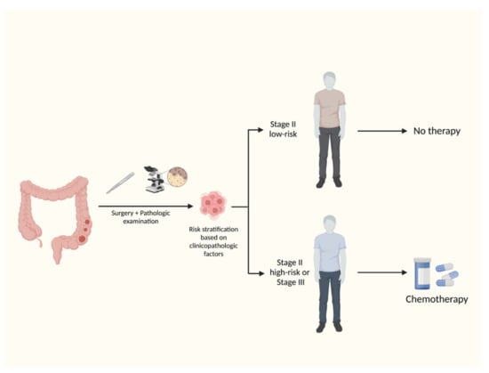 Standard of care of adjuvant therapy of colon cancer. The current selection of patients for adjuvant chemotherapy is based on the presence of prognostic clinicopathologic factors, which offer an inaccurate risk stratification in low-risk and high-risk stage II and stage III colon cancer. Created with Biorender.com.