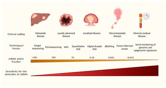 ctDNA is discriminated from normal DNA by sequencing techniques, which detect the presence of mutations, typically found in ctDNA. Standard DNA sequencing techniques, such as Sanger sequencing and pyrosequencing, may detect mutations in small fragments of ctDNA, but only if high allelic fractions are present, such as >10% [18,20]. The detection of smaller allelic fractions has been challenging, and it has been possible by the development of modern techniques, such as digital polymerase chain reaction (PCR) and beads, emulsion, amplification, and magnetics (BEAMing) (Figure 2) [18,20].