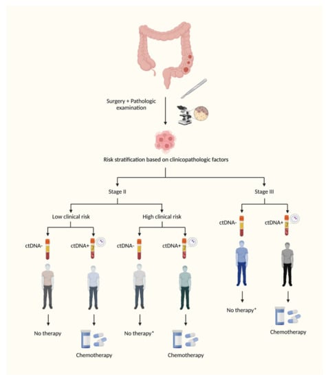 Potential ctDNA-guided postoperative management. This figure illustrates a potential therapeutic algorithm for the decision of adjuvant therapy in colon cancer after the advent of molecular techniques for the detection of minimal residual disease. Certain clinicopathologic factors, such as T4 tumors, have demonstrated significant prognostic value, even in ctDNA-negative patients. Based on the available clinical data, even with the improvement of molecular techniques, it is unlikely that the test will reach very high levels of sensitivity in the first postoperative weeks, when the decision to offer adjuvant chemotherapy has to be made. Hence, it is possible that the combination of molecular (ctDNA) and clinical data might be a reasonable strategy to offer a more personalized therapy for patients with localized colon cancer. * De-escalation of adjuvant chemotherapy in high clinical risk ctDNA-negative patients will only be possible after the development of techniques with very high sensitivity. Created with Biorender.com.