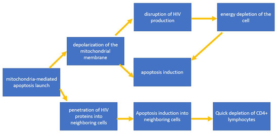Important HIV proteins required for viral replication and integration are structural proteins, including Gag, Pol and Env, in addition to a number of regulatory proteins, including Nef, Vpr, Vif, Vpu, Tat and Rev. It is noted that some of these proteins activate mitochondria-mediated apoptosis [34]. At the same time, apoptosis caused by viral proteins spreads to neighboring cells as a result of the increased expression of these HIV proteins. This hypothesis explains how HIV is able to cause T-helper depletion at a rate that exceeds the rate of virion propagation [35]. Let us consider this mechanism using the Env glycoprotein as an example, which is cleaved into 2 proteins during maturation: gp41 and gp120. The key role in the initiation of apoptosis is played by gp120, which is associated with interactions with co-receptors of CD4+ T-lymphocytes, CXCR4 and CCR5. This interaction ensures the penetration of HIV into the target cell. At the same time, it has been shown that gp120 is able to induce mitochondria-mediated apoptosis by depolarizing the mitochondrial membrane, which primarily leads to a disruption in the process of oxidative phosphorylation and, as a result, also leads to a decrease in ATP production and the energy depletion of T-lymphocytes, finally leading to cell death. Depolarization of the mitochondrial membrane leads to the subsequent rupture of the outer membrane and the release of mitochondrial proteins into the cytoplasm, among which cytochrome C is present, which activates the apoptosis pathway through the activation of caspases 3 and 9 [11]. Due to its ability to bind to cellular receptors, localize to the cytoplasmic membrane of an infected cell and transfer to an adjacent uninfected cell, Env can activate mitochondrial dysfunction and lymphocyte apoptosis without direct infection with virions, which is one of the explanations for the rapid decline in CD4 + T-lymphocytes at an early stage of infections [36]. The general scheme for triggering mitochondria-mediated apoptosis induced by HIV proteins is shown in Figure 3.
