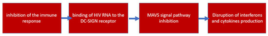 As reported in the previous section, the mitochondrion, or, rather, its signaling protein, MAVS, is the initiator of a cascade that triggers an innate antiviral immune response directed against double-stranded RNA viruses. Since HIV is a double-stranded RNA virus, it is logical to assume that there is a high probability of close interaction between HIV proteins and the mitochondrial MAVS protein, which can change activity in both directions. Indeed, a study [37] showed that MAVS inhibited HIV proliferation, by triggering interferon response genes, and activated dendritic cell maturation. At the same time, the possibility of avoiding the HIV antiviral immune response caused by dendritic cells has been shown. In another study [38], it was found that HIV binds to the DDX3 RNA helicase, which acts as an HIV RNA receptor. As a result, through the activation of the antiviral signaling pathway, in which MAVS plays a central role, the maturation of dendritic cells and the production of interferon and other cytokines occurred. It was observed that the binding of HIV to the C-type lectin 1 receptor DC-SIGN led to the activation of the mitotic kinase PLK1, which suppressed signaling after MAVS, weakening antiviral protection. Thus, changing the preferred receptor for HIV RNA binding is of great importance to the activation of the innate immune response against HIV. The scheme of inhibition of the immune response against HIV is shown in Figure 4.