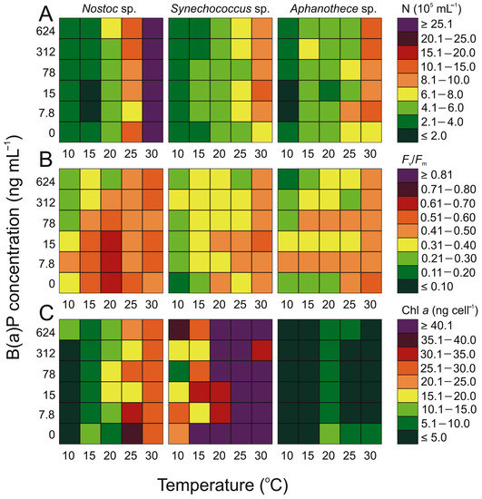 The Fv/Fm was low for the cyanobacteria. The lowest values were obtained in samples with the highest concentration of B(a)P. The maximum Fv/Fm for Nostoc sp. was 0.65 at 20 °C and a B(a)P concentration of 7.8 ng mL−1, which was the same as the blank sample at this temperature. The remaining cyanobacteria were characterized by a lower Fv/Fm, which for Synechococcus sp. at its maximum was 0.52 at 15 ng mL−1 B(a)P and 30 °C, and for Aphanothece was 0.49.