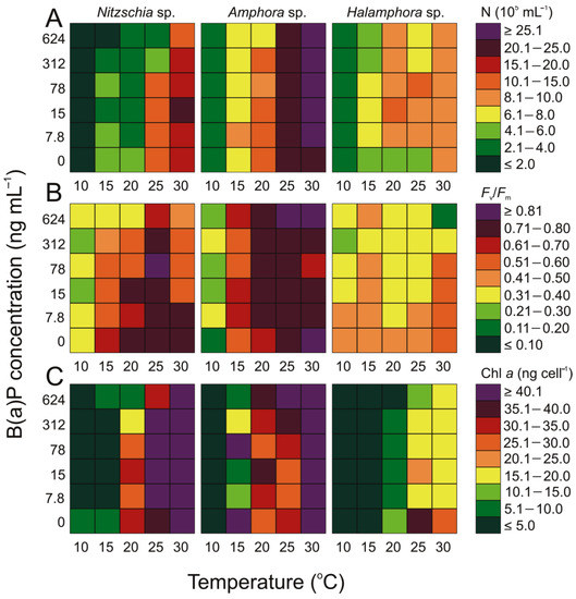 Upon analyzing the concentration of chl a, we found that in some diatoms (Nitzschia sp. and Halamphora sp.), the concentration of chl a decreased with an increase in the concentration of B(a)P (Figure 2). The maximum chl a concentration for Nitzchnia sp. was 64.01 ng cell−1 (at 30 °C and 7.8 ng mL−1 B(a)P). Similarly to the other diatoms, at the lowest temperature, the amount of chlorophyll a was below the detection limit. On the other hand, for Halamphora, the highest value of chl a after adding B(a)P was 21.59 ng cell−1 (at 25 °C and 7.8 ng mL−1), which was much lower than the blank sample for Hamaphora at 25 °C (37.85 ng cell−1). The maximum amount of chl a for Amphora sp. was 70.47 ng cell−1. It was evident that the addition of a small amount of B(a)P (from 0 ng mL−1 to 7.8 ng mL−1) significantly reduced the chlorophyll a content for many diatoms, e.g., from 50.86 ng cell−1 to 11.02 ng cell−1 for Amphora sp. (at 15 °C).