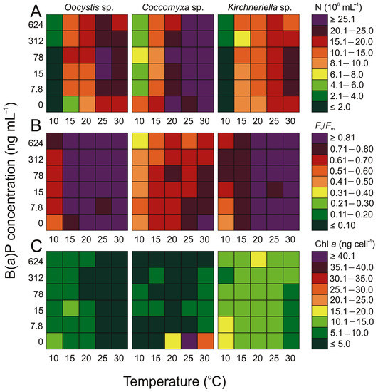 The obtained maximum values amounted to 0.90, 0.79, and 0.89 for Oocystis sp., Coccomyxa sp., and Kirchneriella sp., whereas the minimum values were 0.64, 0.40, and 0.60, respectively. For the green algae, the maximum was noted at 30 °C and B(a)P 15 ng mL−1 for Oocystis sp., 7.8 ng mL−1 for Coccomyxa sp., and from 15 to 624 ng mL−1 for Kirchneriella sp. The minimum values for Oocystis sp. and Kirchneriella sp. were related at 10 °C and 7.8 ng mL−1, whereas for Coccomyxa sp. the minimum value was found at 10 °C and 624 ng mL−1. Both temperature changes and adding a small amount of B(a)P significantly affect the discussed parameter in the case of all strains (ANOVA, p < 0.05; Figure 3).