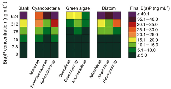 The final concentration of benzo(a)pyrene after 7 days of exposure for individual cyanobacteria and microalgae.