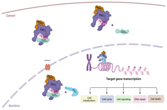 Based on subcellular localization, and substrate recognition, HATs are classified into Type A and Type B enzymes [12]. Type A HATs are linked to transcription genes and divided into five families: GCN5-related N-acetyltransferases (GNAT), MYST, protein 300/CREB-binding protein (p300/CBP), nuclear receptor cofactors (NRCF), and basal transcription factor (TF) family. Two Type B HATs exist, specifically, HAT1 and HAT4, identified as cytoplasmic enzymes responsible for deposition-related acetylation of free, newly synthesized histones before their transport into the nucleus [12]. In this review, we report an update of the biological functions of HAT1 and its involvement in carcinogenesis, highlighting its potential role as a biomarker for cancer.