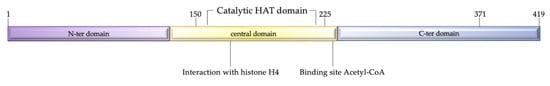 Based on its crystal structure, the HAT1 protein is composed of three domains: N-terminal (amino acids 23–136), central (amino acids 137–270), and C-terminal (amino acids 271–341) [22] (Figure 2). No structural analogies were found between the N- and C-terminal domains of HAT1 with other acetyl transferases; instead, the central domain is structurally similar to other acetyltransferases of the GCN5 and MYST families [23].