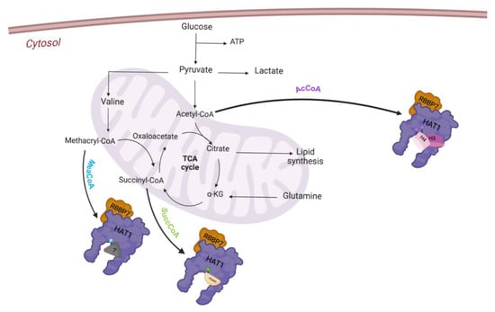 Recent studies have reported that HAT1 is able to modulate other post-transcriptional modifications (PTMs), identified as succinyltransferase for non-histone and histone proteins; it succinylates histone H3 on K122 and phosphoglycerate mutase 1 (PGAM1) on K99. Particularly, HAT1-mediated succinylation regulates gene expression in cancer, contributing to cancer initiation and progression [31]. Recently, it has been demonstrated that in response to changes in cell metabolism, HAT1 can use an alternative cofactor such as methacryl-coenzyme A (MC-CoA), an intermediate product of valine mitochondria metabolism [32]. Lysine methacrylation (Kmea) is a novel type of histone PTM; HAT1 has been identified as displaying an unusual enzymatic activity as writer of this new epigenetic modification (Figure 3) [33].