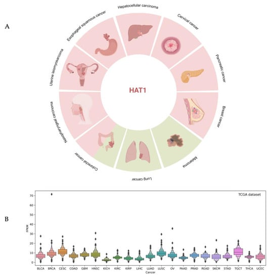Overview of HAT1 expression in human cancer. (A) Schematic representation of the different expression levels of HAT1 in the described cancer. The red and green squares represent the upregulation or downregulation of HAT1 expression levels, respectively. (B) The box plot depicts RNA expression levels in 17 different types of cancer from the TCGA dataset; ♦ represent outliers that differ significantly from the rest of the dataset.
