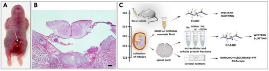 (A) Representative external view of RA-induced MMC defect in the lumbar region of a fetal rat at E21. Arrow indicates the beginning of the exposed spinal cord. (B) Representative H&E-stained cross section from the MMC defect in a fetal rat at E21 demonstrating a malformed spinal cord and failed development of overlying structures. Scale bar indicates 200 µm. (C) Overview of the experimental strategy.