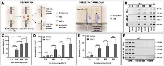 Phosphacan is a secreted spliced extracellular variant of the protein tyrosine phosphatase receptor type Z (PTPRZ; also known as RPTPβ) that is expressed during CNS development and in pathological processes such as tissue injury [,]. Western blotting analysis with the 3F8 antibody, which recognizes phosphacan and long receptor type PTPZ (Figure 2A), revealed an approximately 400 kDa single band of core protein, indicating the presence of secreted phosphacan in the AF of MMC fetuses starting at E14 (Figure 2B). In contrast to the AF of MMC fetuses, only weakly stained bands of phosphacan were visible in the AF of normal fetuses at E14, and their intensity diminished to a barely detectable level after E16 (Figure 2B). The total AF levels of phosphacan were significantly higher in MMC than in normal controls at all examined time points and progressively increased in MMC compared to normal age-matched controls as pregnancy advanced (Figure 2E).