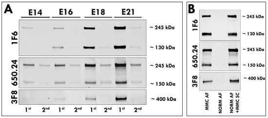 For this study, MMC was induced during neurulation by exposure to all-trans retinoic acid (RA) []. As previously reported, MMC fetuses displayed defects characterized by a pathological opening in the vertebral arch and the overlying skin, with the spinal cord exposed at the center of the lesion confined to the lumbosacral area of the fetus [,,] (Figure 1A,B). AF samples collected from fetal rats with MMC defects and age-matched normal controls at four time points in gestation (E14, E16, E18 and E21) were treated with chondroitinase ABC (ChABC) to degrade polysaccharides and examined using Western blotting (Figure 1C). Following immunoblotting with the 1F6 antibody, which recognizes the N-terminal epitope of neurocan (Figure 2A), a faint band representing a full-length neurocan (245 kDa core protein) was detected in the AF of MMC fetuses at E14 (Figure 2B). Both forms of neurocan, representing the full-length neurocan (245 kDa core protein) and the proteolytically cleaved N-terminal neurocan fragment (130 kDa core protein), were present in the AF of MMC fetuses starting at E16 (Figure 2B). Compared with E14, the total level of neurocan in the AF of MMC fetuses was significantly elevated at E16, followed by a smaller but significant increase at E18, reaching the highest level at E21 (Figure 2C). In sharp contrast to these results, the signal for neurocan was not detectable in the AF of normal age-matched fetuses (Figure 2B). Immunoblotting with the 650.24 neurocan antibody, which recognizes the C-terminal epitope (Figure 2A), revealed detection of full-length neurocan, as well as the proteolytically cleaved C-terminal neurocan fragment (150 kDa core protein), in the AF of MMC fetuses starting at E14, with a rapid increase in the intensity of the neurocan signal between E14 and E16 and its peak at E21 (Figure 2B). Only faintly stained bands of neurocan, predominantly corresponding to C-terminal neurocan fragments, were identified in the AF of normal fetuses (Figure 2B). Quantitative analysis showed that the total AF level of neurocan was significantly elevated in MMC compared to normal controls at each examined gestational age (Figure 2D). Moreover, the total level of neurocan in the AF of MMC fetuses robustly increased with gestational time, reaching the highest level at E21 (Figure 2D). Western blotting analyses demonstrated the presence of full-length neurocan, the proteolytically cleaved N-terminal neurocan fragment, and the C-terminal neurocan fragment in MMC spinal cord lysates that were used as positive controls (Figure 2B), indicating that the molecular forms of neurocan identified in the AF of MMC fetuses and MMC spinal cords were qualitatively similar.