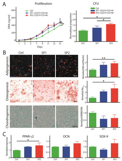 Functional properties of fractions sorted and expanded from the thawed ASC passage P4. (A) Proliferation rate and colony-forming capacity. (B) Histochemical analysis of trilineage differentiation by staining in culture with Nile red and alizarin red for adipo- and osteogenesis, respectively. Chondrogenesis was evaluated in paraffin-embedded and sectioned micromass cultures stained with alcian blue. The Nile red accumulation was quantitated in situ by fluorometry and the other two dyes after extraction with spectrophotometry. (C) Transcriptional expression of differentiation-representative factors by real-time RT-PCR. The complementary phenotype to the one indicated for the SP1 and SP2 subsets featured the CD34− CD36− CD200− CD248− CD271− Stro-1− marker profile. The data are presented as a mean + SEM from two independent experiments (n = 6–8). * p < 0.05, and ** p < 0.01. Abbreviations: Abs, absorptions; SP, subpopulation; Ctrl, control; CFU, colony-forming unit; DMMB, 1,9-dimethylmethylene blue; PPAR-γ2, peroxisome proliferator-activated receptor gamma 2; OCN, osteocalcin; SOX-9, SRY-box transcription factor 9.
