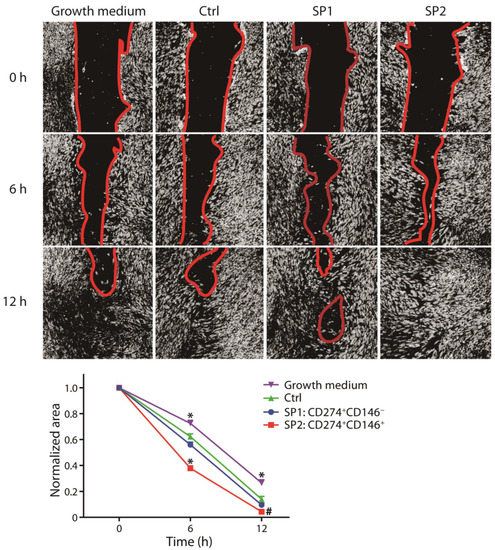 Capacity of fractions sorted and expanded from the thawed ASC passage P4 to promote the wound healing. The closure of the scratch wound in the fibroblast monolayer upon stimulation with different supernatants was monitored using phase contrast microscopy and quantitated by micromorphometric analysis. The complementary phenotype to the one indicated for the SP1 and SP2 subsets featured the CD34− CD36− CD200− CD248− CD271− Stro-1− marker profile. The data are presented as a mean + SEM from two independent experiments (n = 23). *, statistically significant difference from other groups at p < 0.05; and #, statistically significant difference from Ctrl and the growth medium at p < 0.05. Abbreviations: SP, subpopulation; Ctrl, control.
