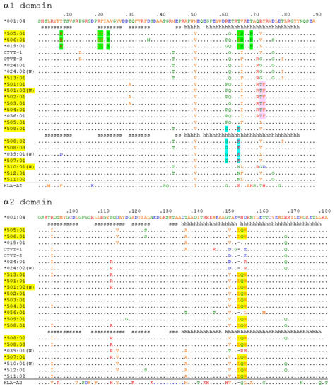 The mosaic distributions of the LQW motif and other sequence motifs, highlighted in Figure 2 by green, pink, and cyan shading, are indicative of interallelic recombination events. The two DLA-88 alleles of canine transmissible venereal tumor (CTVT) [39], here denoted as DLA-88*CTVT-1 and -CTVT-2 (they are not included in the PDB database), do not possess the LQW motif (Figure 1 and Figure 2).