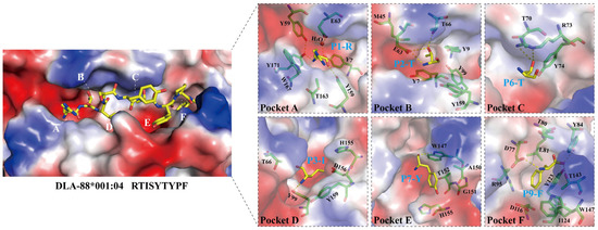Structural analysis of the PBG of pDLA-88*001:04, its peptide ligand RTI9, and its six binding pockets A-to-F. The H chain is shown in surface format and colored based on vacuum electrostatics: red represents negatively charged, blue represents positively charged, and white represents noncharged. The RTI9 residues are shown in sticks format and element coloring; yellow for carbon, red for oxygen, blue for nitrogen. In the figures on the right, the individual pockets are enlarged and the surface presentation of the H chain is transparent; the H chain residues that interact with the indicated RTI9 residue are highlighted in magenta sticks format.