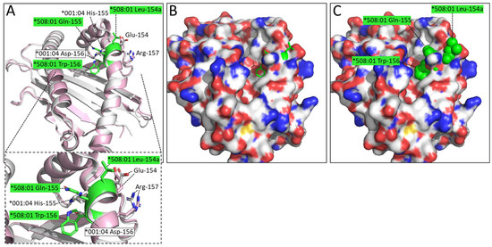 The LQW motif in pDLA-88*508:01 (PDB 5F1I) creates marked differences compared to pDLA-88*001:04 by having Leu-154a at the top of the α2 helix and Trp-156 at the border between the D and E pockets. Superposition of α1α2 domains: ((A), with zoomed-in view) pDLA-88*001:04 in white and pDLA-88*508:01 in pink, the sidechains of their positions 154-to-157 in sticks format and element coloring; the residues of the LQW motif are highlighted in green; (B) Same as (A) although in a slightly different orientation to show the open groove better, and with the DLA-88*001:04 α1α2 domain shown in surface format with element coloring and the sidechains of residues 154a-to-156 of DLA-88*508:01 154a-to-156 shown in all-green sticks format; (C) same as (B) but with the DLA-88*508:01 154a-to-156 residue sidechains shown in spheres format.