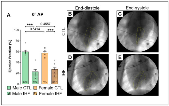 In IHF a significant reduction of the ventricular ejection fraction (EF) was observed (Figure 1A and Figure 2A). In male IHF pigs the EF was significantly lower than in male control pigs (EF 0° AP CTL vs. IHF: 59.6 ± 2.5% vs. 22.9 ± 4.1%, *** p < 0.001; Figure 1A; 30° LAO: 59.0 ± 2.2% vs. 35.4 ± 3.2%, *** p < 0.001; Figure 2A). Consistently, in female pigs the EF was significantly reduced in IHF animals as well (EF 0° AP CTL vs. IHF: 57.2 ± 2.8% vs. 26.8 ± 4.2%, *** p < 0.001; Figure 1A; 30° LAO: 58.6 ± 3.0% vs. 31.8 ± 3.9%, *** p < 0.001; Figure 2A). No differences were observed between male and female pigs. Hemodynamic measurements obtained from right heart catheterization using a Swan-Ganz catheter (Edwards Lifesciences, Irvine, CA, USA) indicated an increase in pulmonary arterial pressure (PAP), pulmonary capillary wedge pressure (PCWP) and right arterial pressure (RAP) in both IHF groups compared to their respective control groups (Supplemental Figure S1).