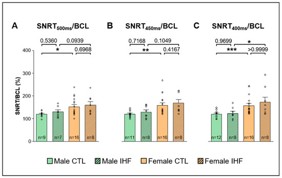 The uncorrected sinus node recovery times measured at pacing cycle lengths of 500 ms, 450 ms, and 400 ms showed significant differences between male and female control pigs (Supplemental Figure S2). Female control pigs showed a significantly longer sinus node recovery time to basic cycle length quotient (SNRT/BCL) at all stimulated cycle lengths compared to male control animals (male vs. female: at 500 ms: 119.6 ± 4.3% vs. 152.6 ± 9.7%, * p < 0.05; at 450 ms: 120.5 ± 4.3% vs. 159.1 ± 10.7%, ** p < 0.01; at 400 ms: 119.9 ± 4.5% vs. 157.9 ± 10.0%, *** p < 0.001; Figure 5A–C). A similar trend between the two sexes could be observed in IHF pigs, but only at a stimulated cycle length of 400 ms the difference was statistically significant (male vs. female: 123.6 ± 8.8% vs. 172.5 ± 22.1%, * p < 0.05; Figure 5C). Between control and IHF animals of each respective sex, however, no difference was observed.