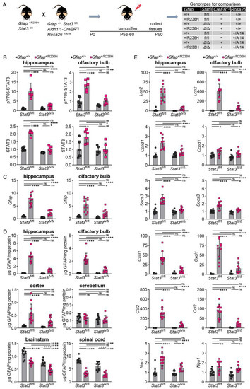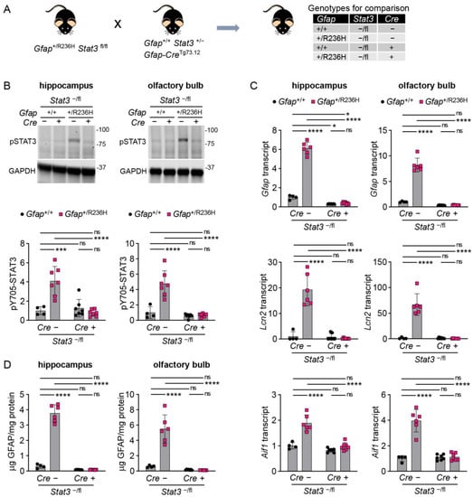 3.3. Conditional Knockout of STAT3 in Gfap Expressing Cells Prevents GFAP Elevation and Stress Response in AxD Model Mice