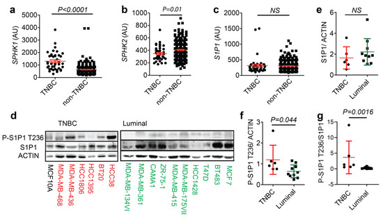 Figure 1. Phospho-S1P1 T236 Levels, but not Total S1P1, are Elevated in Human TNBC Cells. (ac) Relative transcript levels of SPHK1 (a), SPHK2 (b), and S1P1 (c) in human TNBC (n = 41) and non-TNBC samples (n = 385) from a reanalyzed microarray dataset (GSE2034; [24]). (d) Western blot analysis of phospho-S1P1 T236 (P-S1P1 T236), total S1P1, and ACTIN levels in human TNBC (n = 6) and luminal (n = 10) cell lines with MCF10A nontransformed cell line as a control. (eg) S1P1 (e) and P-S1P1 T236 (f) to ACTIN as well as P-S1P1 T236 to S1P1 ratio (g) in TNBC and luminal breast cancer cell lines. Data indicate mean ± SEM.
