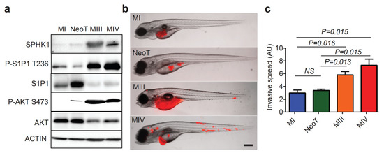Figure 2. Increased Levels of P-S1P1 T236 are linked with TNBC Progression. (a) Western blot analysis of SPHK1, P-S1P1 T236, S1P1, phospho-AKT S473 (P-AKT S473), AKT, and ACTIN levels in human MI, NeoT, MIII, and MIV cells. (b) Overlay of brightfield and fluorescence images of zebrafish embryos transplanted with RFP+ human MI, NeoT, MIII, and MIV cells at 3 days post-transplantation (dpt; n = 3 per group). The scale bar represents 200 µm. (c) Quantification of invasive spread in zebrafish embryos based on fluorescence intensity of MI, NeoT, MIII, and MIV cells (n = 3 per group). Data presented as Mean ± SEM. NS, not significant.