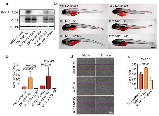 Figure 3. P-S1P1 T236 contributes to the distant spread of TNBC. (a) Western blotting analysis of P-S1P1 T236, S1P1, and ACTIN in MIII and MIV cells overexpressing Luciferase, S1P1 WT, or the phosphorylation-defective S1P1 T236A mutant. (b) Overlay of brightfield and red fluorescence images of zebrafish xenografts transplanted with RFP+ MIII and MIV cells overexpressing Luciferase, S1P1 WT, or S1P1 T236A at 3 dpt (right panel). (c) Quantification of invasive properties of MIII and MIV cells overexpressing Luciferase, S1P1 WT, or S1P1 T236A in zebrafish xenografts based on fluorescence intensity of RFP+ tumor cells outside of the initial injection area (n = 6 for MIII and MIV overexpressing Luciferase, and n = 3 for MIII and MIV overexpressing S1P1 WT or S1P1 T236A). (d,e) Wound-scratch assay (d) and quantification (e) show increased migration properties of MIII cells overexpressing S1P1 WT though not S1P1 T236A at 21 h after wound scratch, compared to control Luciferase-overexpressing cells (n = 3 per group). Data are presented as Mean ± SEM. Scale bar = 200 µm in (b) and Scale bar = 5 μM in (d).