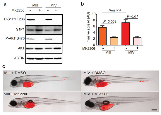AKT binds directly to the third intracellular loop of the S1P1 receptor and phosphorylates its T236 residue in endothelial cells [14]. To determine if this mechanism also operates in TNBC cells, we treated the MCF10A series with MK2206, a potent allosteric pan-AKT inhibitor tested in clinical trials for treating advanced-stage solid tumors. Western blot analysis of MIII and MIV cells showed that a low dose of MK2206 (90 nM) effectively inhibited AKT S473 phosphorylation (Figure 4a), while total AKT and S1P1 expression appeared slightly upregulated. Surprisingly, the treatment of the four MCF10A series of cell lines with MK2206, ranging from low to high concentrations (up to 30 μM), did not reduce cell viability after 48 h of treatment (Figure S3), a result consistent with an early report on MCF10A by others [31]. To determine if AKT is responsible for the S1P1-mediated invasion of human TNBC cells in vivo, we monitored the dissemination of MIII and MIV cells treated with MK2206 in zebrafish embryos (Figure 4b,c). Despite similar tumor burdens introduced (Figure S4a), MK2206 significantly suppressed the distant spread of MIII and MIV cells at three dpt, compared to vehicle-treated control cells (Figure 4b,c).