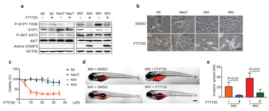 Figure 6. FTY720 induces apoptosis and suppresses the distant spread of human TNBC cells with high P-S1P1 T236 Levels. (a) Western blot analysis of P-S1P1 T236, S1P1, P-AKT S473, AKT, active CASPASE 3 (CASP3), and ACTIN levels in MI, NeoT, MIII, and MIV cells before and after FTY720 treatment (2 μM). (b) Brightfield images of MI, NeoT, MIII, and MIV cells at 48 h post-treatment with DMSO or FTY720 (n = 3 per group). The scale bar represents 1 µM. (c) The proportion of viable cells in response to a dose gradient of FTY720 shows a significantly reduced viability of MIII and MIV though not MI nor NeoT cells (n = 3 per group). (d) Overlay of brightfield and fluorescence images of zebrafish embryos injected with RFP+ MIII and MIV cells treated with DMSO or FTY720 (2 μM) at 3 dpt (n = 3 per group). The scale bar represents 200 µm. (e) Quantification of fluorescent intensity of tumor cells described in (d) Shows FTY720′s ability to inhibit the distant spread of TNBC cells (n = 3 per group). Data indicate mean ± SEM.