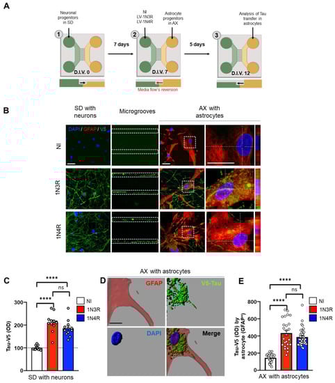 Glass coverslips were coated overnight at 4 °C with 0.5 mg/mL poly-D-lysine. Microfluidic chambers (AXIS™, Temecula, CA, USA) were subsequently placed on the coated glass coverslips and attached to the glass. All chambers had microgrooves 450 μm in length and 10 μm in width. Rat primary embryonic neurons were cultured as described above, and approximately 30,000 cells were plated in the two wells of the somatodendritic compartment. The cultures were maintained at 37 °C for 7 days to allow differentiation, with a volume gradient from the somatodendritic compartment to the astrocytic compartment to assist with axonal guidance. At D.I.V. 7, Tau-V5-LV (200 ng of LV per well) was added to the somatodendritic compartment after first reversing the volume gradient between the compartments to counteract viral diffusion. The quality controls for compartment isolation were as previously described by Dujardin and collaborators []. Primary astrocytes were then plated in the axonal compartment in neurobasal medium and maintained at 37 °C for 5 days. V5 immunolabeling was performed to evaluate tau transfer from neurons to astrocytes. The cells in the compartments (somatodendritic and axonal) were washed once with phosphate-buffered saline (PBS) and fixed with 4% paraformaldehyde (PFA) for 20 min. After removing the fixative, the cells were washed three more times with 50 mM NH4Cl and permeabilized with Triton X-100 (0.1%, 10 min at room temperature). Subsequently, the slides were incubated with primary antibodies at 4 °C overnight, and labeling was performed by incubation with the appropriate Alexa Fluor conjugated secondary antibodies (1:400) for 45 min at room temperature. The cells were mounted with Vectashield medium containing DAPI.