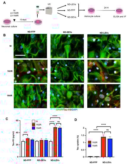 Primary hippocampal astrocytes were isolated from postnatal day 1 rat pups (Wistar rats from Janvier Laboratory), as previously described []. Briefly, the brains were removed aseptically from the skulls, the meninges were excised under a dissecting microscope, and the hippocampus was dissected. The cells were dissociated by passage through needles of decreasing gauge (1.1 × 40; 0.8 × 40; and 0.5 × 16) 4 or 5 times with a 5-mL syringe. The cells were plated at a density of 20,000 cells per cm2 in 6-well plates in DMEM containing 25 mM glucose and supplemented with 10% fetal calf serum, 44 mM NaHCO3, and 10 mL/L antibiotic/antimycotic solution (pH 7.2) in a final volume of 3 mL/well, and incubated at 37 °C in an atmosphere containing 5% CO2/95% air. The culture medium was replaced 4–5 days after plating and every 2–3 days thereafter, after gently tapping the plates to remove the less adherent cells (oligodendrocytes and microglia). For the neuron-to-astrocyte tau transfer experiment, 105 astrocytes (1 well) were treated with 10 µL of neuron-derived small EVs (ND-SEVs), neuron-derived large EVs (ND-LEVs), and neuron-derived free protein (ND-FFP) (obtained from 106 neurons, 1 well) at 10 days in vitro (D.I.V. 10).