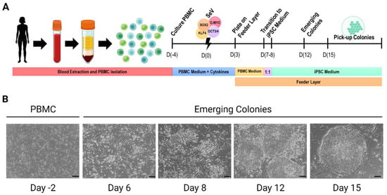 Cell reprogramming of human PBMC. (A). Generation of hiPSC lines by SeV cell reprogramming technology. (B). Images of cell reprogramming procedure. Scale bar = 100 μm. (Created with BioRender.com, accessed on 1 December 2022).