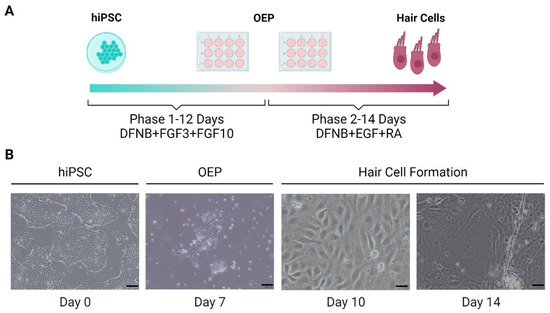 Schematic representation of 2D differentiation protocol of hPSCs-derived hair cells. (A). Protocol of the generation of inner ear hair cells from hPSCs. (B). Images obtained by microscopy of hair cell formation. Scale bar at day 0 and 7 =100 μm and at day 10 and 14 =20 μm. OEP: Otic epithelial progenitor. (Created with BioRender.com, accessed on 4 December 2022).
