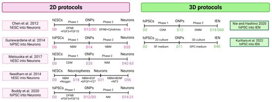 2D and 3D hPSCs-derived inner ear hair cells protocols [12,13,14,15,17,18,101,104]. (Created with BioRender.com, accessed on 22 March 2023).