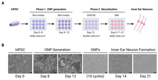 Inner ear neurons generation from hiPSCs. (A). Differentiation protocol of hPSC-derived inner ear neurons in 2D culture from Boddy et al. [101]. (B). Images of inner ear neurons culture derived from hiPSC. Scale bar = 100 μm. ONP: otic neural progenitor. OSCFM: otic stem cell full media. NM: neuralizing media. (Created with BioRender.com, accessed on 22 March 2023).