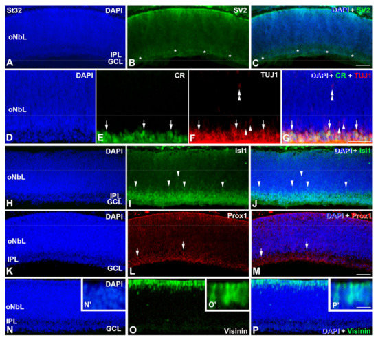 The DAPI staining reveals the emergence of the inner plexiform layer (IPL) at St32 (Figure 4). The appearance of the IPL is confirmed with the antibody against synaptic vesicles type 2 (SV2), that identifies functional synapses externally to the presumptive GCL (Figure 4A–C). Most of the cells located in the presumptive GCL are labeled with antibodies against CR/TUJ1 (Figure 4D–G) and Isl1 (Figure 4H–J). However, scarce TUJ1-labeled cells with an elongated shape and weaker staining are found in the oNbL (Figure 4D–G). The nuclei of these cells are also immunostained with Isl1 (Figure 4H–J). Most of the Prox1-immunoreactive nuclei are located in the presumptive GCL, but some of them are distinguishable in the inner surface of the oNbL (Figure 4K–M). Abundant cells appear strongly immunolabeled in the scleral surface of the oNbL with antibodies against visinin (Figure 4N–P). These cells show an inner segment that contains the nucleus and a long outer segment (Figure 4N′–P′).
