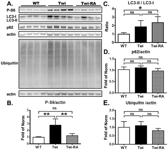 Rapamycin upregulates autophagy. (A) Proteins were extracted from Triton-X buffer (soluble fraction). Immunoblotting analyzed for autophagy related proteins phospho-S6 (P-S6), LC3-I, LC3-II, sequestosome1/p62 (p62), and ubiquitin in brain stem from wild-type (WT), untreated twitcher (Twi), and rapamycin-treated twitcher (Twi-RA) mice at 35 days of age. Quantitative analysis of the results of immunoblots are shown in (B) for P-S6, in (C) for LC3 II/LC3-I ratio, in (D) for p62, and in (E) for ubiquitin. Protein levels are normalized to actin. Values are expressed as mean ± SD and compared using One way ANOVA (Tukey post hoc test) (n = 4). Statistical significance, * p < 0.05, ** p < 0.01, and ns (not significant).