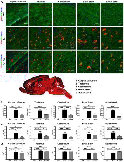 Total particles of p62 aggregates alleviated by rapamycin. (A) Representative images of p62 (red), PLP (green), and nuclei (DAPI) immunostaining in different regions of the brain of wild-type (WT), untreated twitcher (Twi), and rapamycin-treated twitcher (Twi-RA) mice at 35 days of age. Scale bars: 200 μm. Total amounts of p62 aggregates per square millimeters (B), the percentage of area occupied by p62 aggregates (C), and the average size of p62 aggregates (D) were quantitatively analyzed with ImageJ. Values are expressed as mean ± SEM and compared using One way ANOVA (Tukey post hoc test) (n = 5). Statistical significance, * p < 0.05, ** p < 0.01, *** p < 0.001, and ns (not significant).