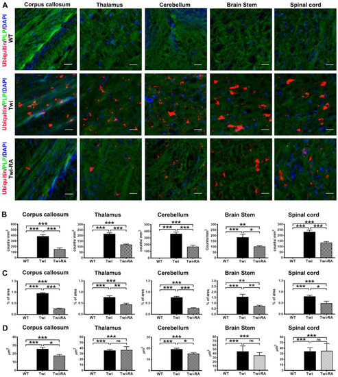 Accumulation of ubiquitin aggregates alleviated by rapamycin. (A) Representative images of ubiquitin (red), PLP (green), and nuclei (DAPI) immunostaining in different regions of the brain of wild-type (WT), untreated twitcher (Twi), and rapamycin-treated twitcher (Twi-RA) mice at 35 days of age. Scale bars: 200 μm. Total amounts of ubiquitin aggregates per square millimeters (B), the percentage of area occupied by ubiquitin aggregates (C), and the average size of ubiquitin aggregates were quantitatively analyzed with ImageJ (D). Values are expressed as mean ± SEM and compared using One way ANOVA (Tukey post hoc test) (n = 5). Statistical significance, * p < 0.05, ** p < 0.01, *** p < 0.001, and ns (not significant).
