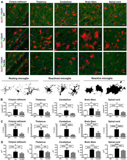 Early activation of microglia contributing to the formation of globoid cells represents the hallmarks of GLD pathology and plays a pivotal role in the mechanism of demyelination [27,32]. Herein, microglia were recognized by immunofluorescent staining (n = 5 in each group) (Figure 6A). Microglia phenotypes resting, activated, and reactive microglia were characterized by their distinctive morphology (Figure 6A). The resting microglia phenotype is typically characterized by small soma and ramified processes. After activation, resting microglia undergo morphological changes characterizing by hypertrophic cell bodies with bush, long, or short thickened processes [28]. Furthermore, the activated microglia are polarized into reactive phenotype characterized by ameboid or enlarged multinucleated phagocytes (globoid cells) without cellular processes in the CNS of GLD [28]. In this study, the resting microglia comprised most of the microglia observed in the brains of wild-type mice, while the reactive microglia with ameboid-like and muti-nucleus giant globoid cells were increased in the brains, especially the brain stem and spinal cord, of untreated twitcher mice (Figure 6A).