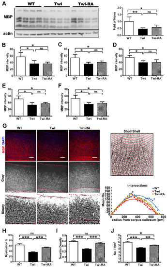 Rapamycin preserves myelin architecture. (A) Western blot analysis of MBP expression in brain stem of wild-type (WT), untreated twitcher (Twi), and rapamycin-treated twitcher (RM) mice brains at ages 35 days. Band intensities were measured by densitometry, normalized to actin expression, and are relative to wild-type mice. Values are expressed as mean ± SD and compared using One way ANOVA (Tukey post hoc test). (n = 4). The brain was immuno-stained with anti-MBP. Myelination of MBP fluorescence intensity in corpus callosum (B), thalamus (C), cerebellum (D), brain stem (E), and spinal cord (F) was quantitatively analyzed with ImageJ. Cortical myelination (dash area) was quantitatively analyzed with ImageJ. (G) Illustration of cortical myelination in MBP fluorescence (red), gray, and binary images, respectively. The proportion of myelination (H) and neuritis density (I) in field of cortex were quantified by measuring the MBP gray value and binary images, respectively. Microstructure complexity of cortical myelination was assessed by Sholl analysis and the numbers of intersections for concentric circles was plotted (G) and summed (J) for comparison. Values are expressed as mean ± SEM and compared using One way ANOVA (Tukey post hoc test) (n = 5). Statistical significance, * p < 0.05, ** p < 0.01, *** p < 0.001, and ns (not significant). Scale bar: 200 μm.
