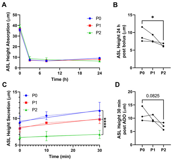 We have previously used mostly primary, but also P1 HBECs, for our epithelial transport studies, and we have not tested whether passage number affects phenotype. To evaluate whether vectoral fluid transport was impaired by passage, we measured ASL height by confocal microscopy over time. ASL homeostasis is an integration of active anion secretion vs. cation absorption, along with passive movement of the corresponding counter ion and water [26]. HBECs typically absorb excess ASL in a Na+/ENaC-led manner, after which point, soluble ENaC inhibitors (e.g., the short palate lung and nasal epithelial clone 1 (SPLUNC1) accumulate, leading to ENaC inhibition and the predominance of cAMP-led anion secretion via CFTR [27]. To track ASL height, we added a bolus of test solution (20 μL of PBS). Regardless of passage, HBECs absorbed ASL similarly over the initial 8 h (Figure 1A). However, by 24 h, P2 cultures had a significantly lower steady-state ASL height compared with P0 cultures (Figure 1A,B). At steady state (i.e., 24 h after PBS addition), we then added adenosine (ADO) mucosally as a dry powder in perfluorocarbon to stimulate CFTR-mediated ASL secretion, as described previously [28]. P0 cultures robustly secreted ASL in response to ADO; however, ADO-induced secretion was reduced in P1 cultures and essentially abolished in P2 cultures (Figure 1C,D), suggesting that passage had a greater impact on anion secretion than on Na+ absorption.