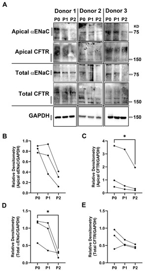 To further study this phenomenon, we performed surface biotinylation followed by Western blot on primary and passaged HBECs. αENaC was moderately decreased in the apical membrane (p = 0.08); however, total αENaC significantly decreased over 2 passages (Figure 2A,B,D). We did not detect any change in total CFTR (Figure 2A,C,E). However, consistent with the decrease in ADO-mediated anion secretion (Figure 1), we observed a significant decrease in CFTR protein at the apical plasma membrane. These changes suggested that the decrease in apical membrane protein abundance may involve altered protein trafficking rather than a decrease in total CFTR. The apparent trend towards decreased apical αENaC levels did not correlate with the observed changes in ASL absorption, because reduced ENaC would be predicted to increase ASL height. However, ENaC was likely working under basal conditions and may not have been maximally stimulated since exogenous proteases that can cleave and activate ENaC were not added to the system [29]. In contrast, passage seemed to affect both ASL secretion and CFTR expression, suggesting that CFTR-mediated anion secretion was more affected by passage than ENaC. Indeed, we have previously observed that the inhibition of CFTR or basolateral Cl− uptake also results in a reduction in steady-state ASL height [30]. Thus, we speculate that the 24 h decrease in ASL height seen in P2 HBECs (Figure 1B) may have been caused by the lack of CFTR.