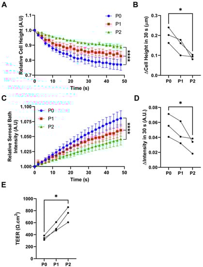 Next, we measured the impact of passage on HBEC water permeability. As previously described, we exposed HBECs to a hypertonic saline challenge (450 mOsm) and then measured the rate of cell shrinkage as a marker of transapical water permeability [20]. We also measured the concentration of an impermeable dye in the serosal compartment (rhodamine conjugated to 10 kDa dextran) as a marker of transepithelial water permeability. Passage from P0 to P2 resulted in a significant decrease in cell shrinkage, indicating that HBEC passage significantly decreased transapical water permeability (Figure 3A,B). The concentration of rhodamine trended towards being reduced following the osmotic challenge (Figure 3C,D). Thus, these data predict that fluid transport, a key feature of epithelial function, would be diminished with passage.
