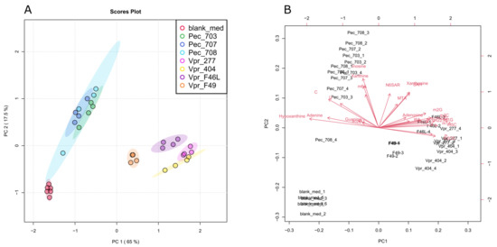(A) Discrimination of investigated cell lines’ exometabolite profile by principal component analysis (PCA) indicating similarities and differences between samples and groups. Shaded area = confidence ellipses show 95% confidence regions. Percentage of variance explained by individual component is indicated, with PC 1 reaching 65 % variance and PC2 reaching 17.5% variance. Samples represented by dots. N = 4 for PEC and VPR, N = 6 for blank. (B) PCA Biplot displays how the individual metabolites contribute to the discrimination of the groups.